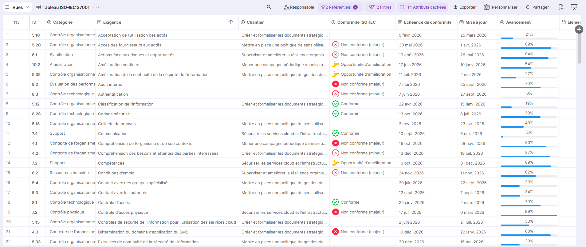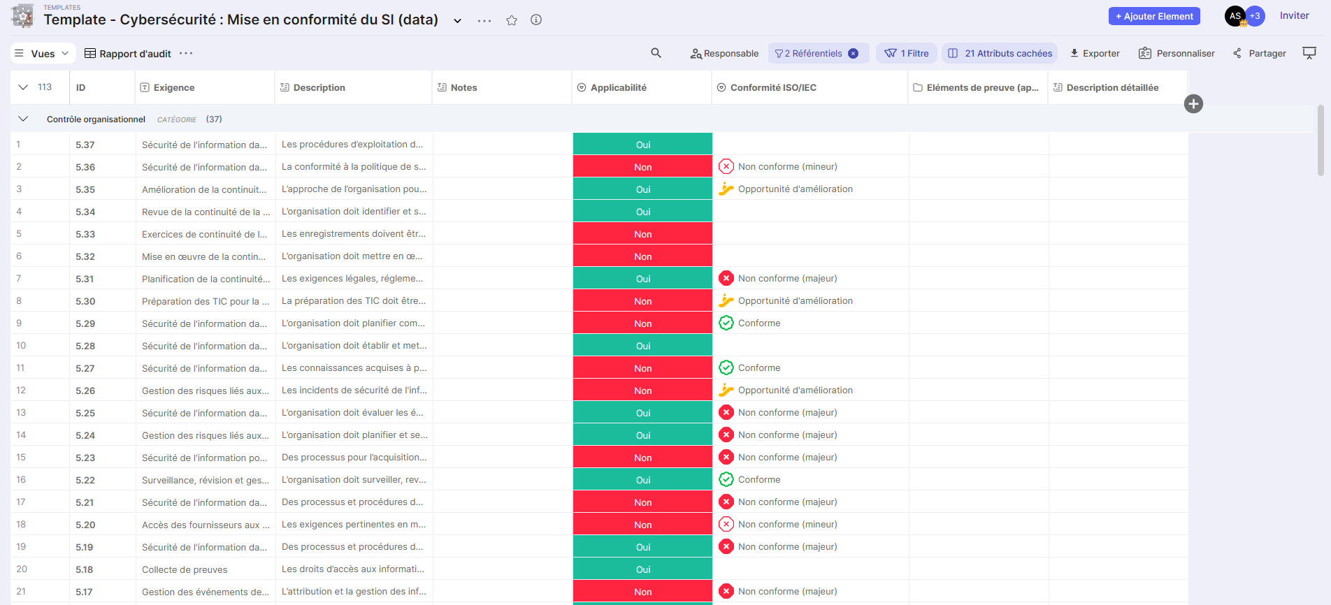 The compliance attribute allows an auditor to assess this value according to the chosen framework. In the specific case of ISO 27001, the framework's compliance levels are implemented (Non-compliant (minor) / Non-compliant (major) / Opportunity for improvement / Strength / Sensitive point).