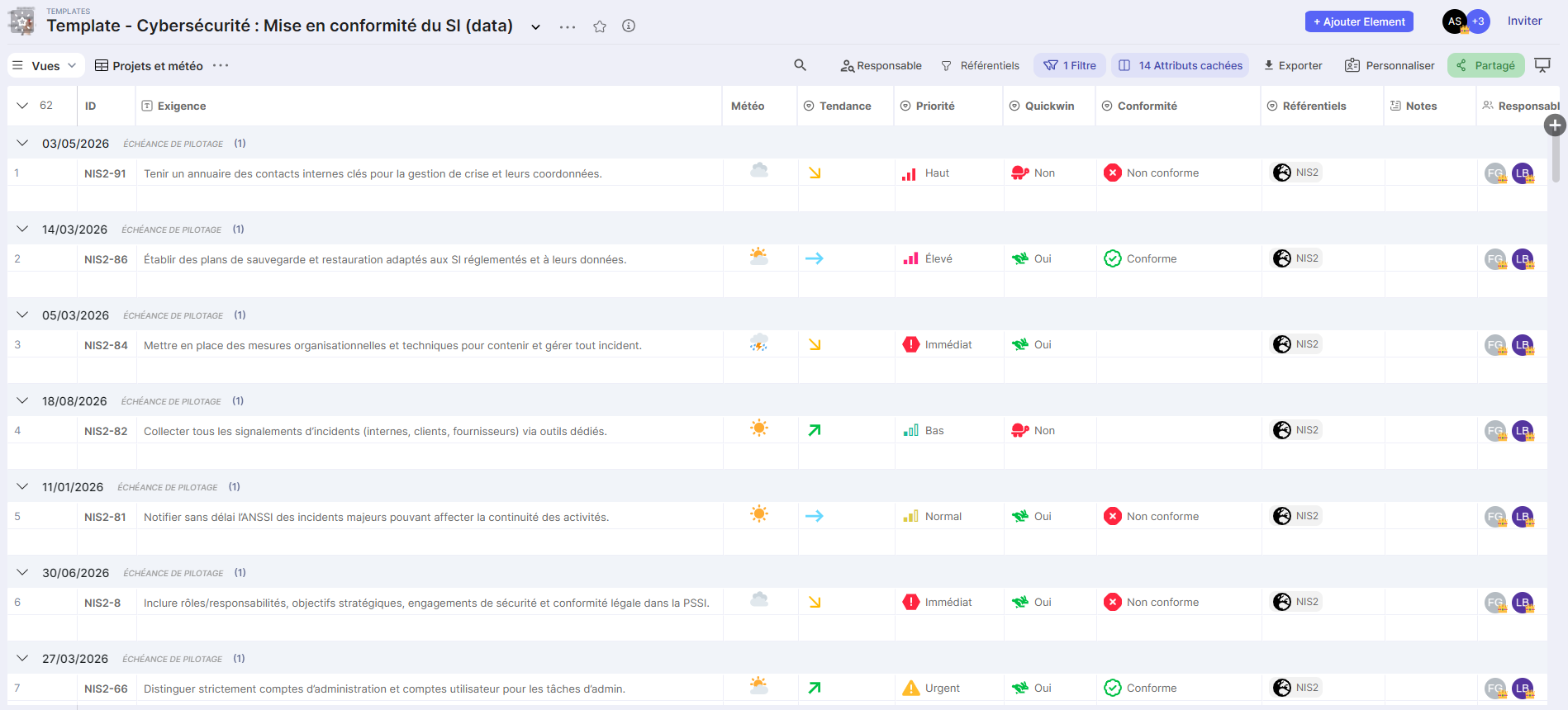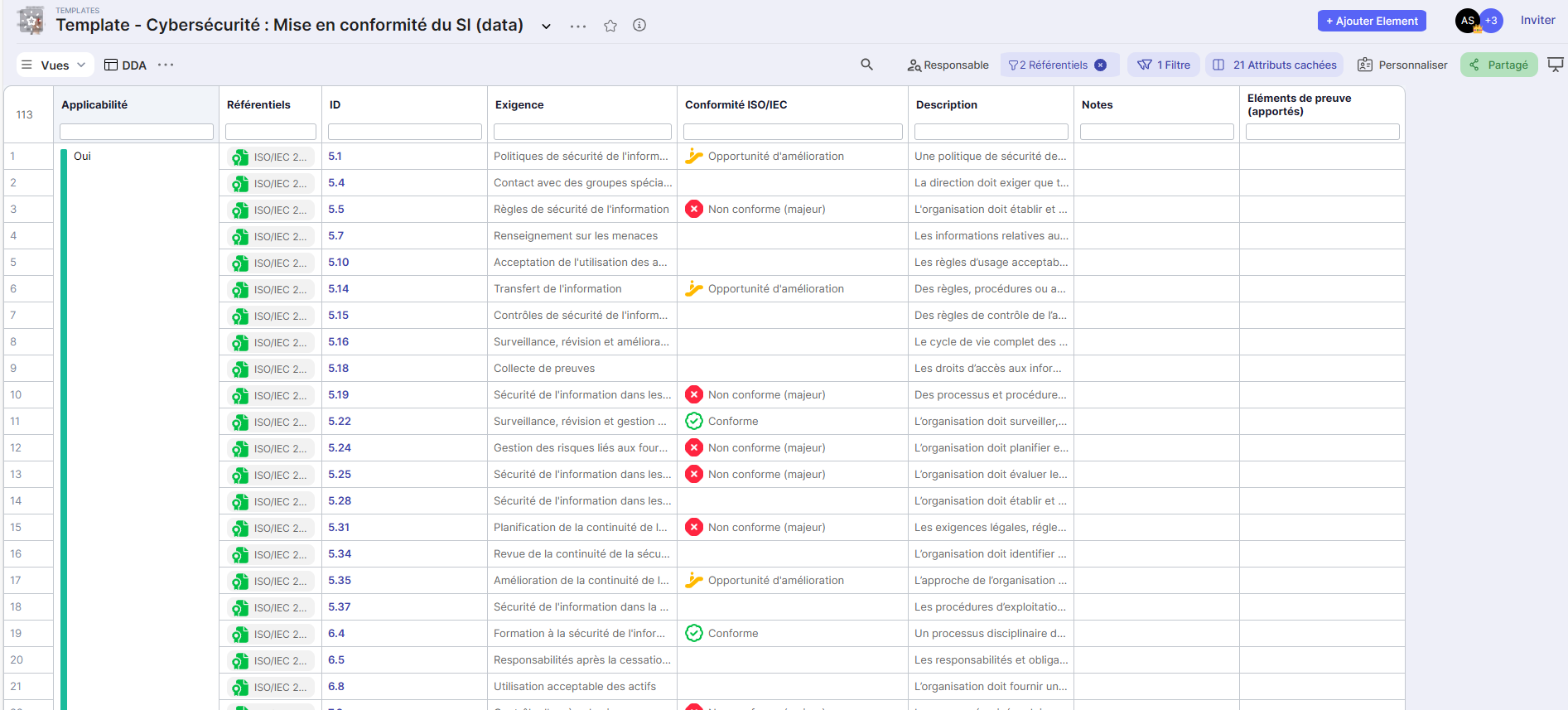 The Compliance template (category Cybersecurity) allows you to manage your compliance according to multiple frameworks (ISO/IEC 27001:2022, NIS2, ANSSI, DGA RMC Fundamental) by evaluating each requirement, attaching evidence, and then prioritizing remediation actions (gain/effort/risk).