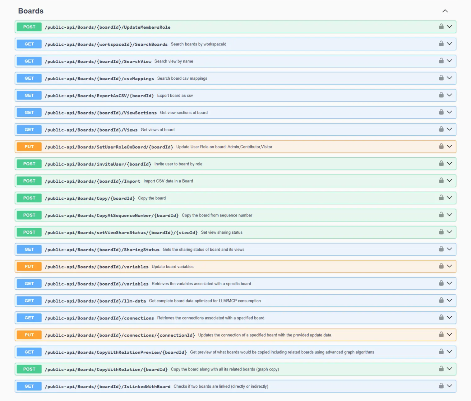 The Board section groups the endpoints for managing a board's variables and connections.