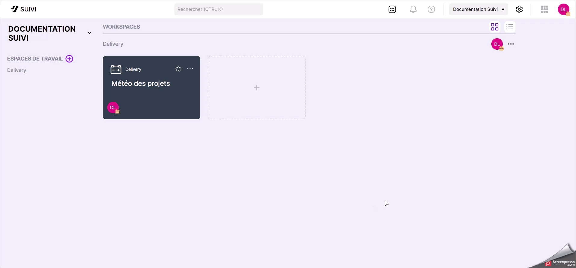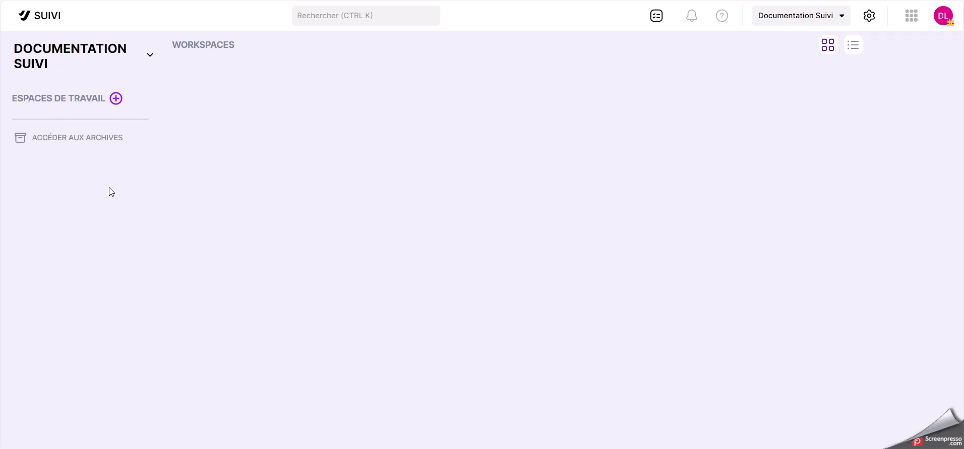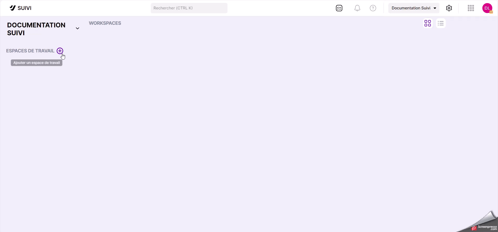 A l’arrivée sur la page d’accueil de Suivi, vous ne disposez d’aucun espace de travail. Vous devez donc commencer par en créer un de la manière suivante :
