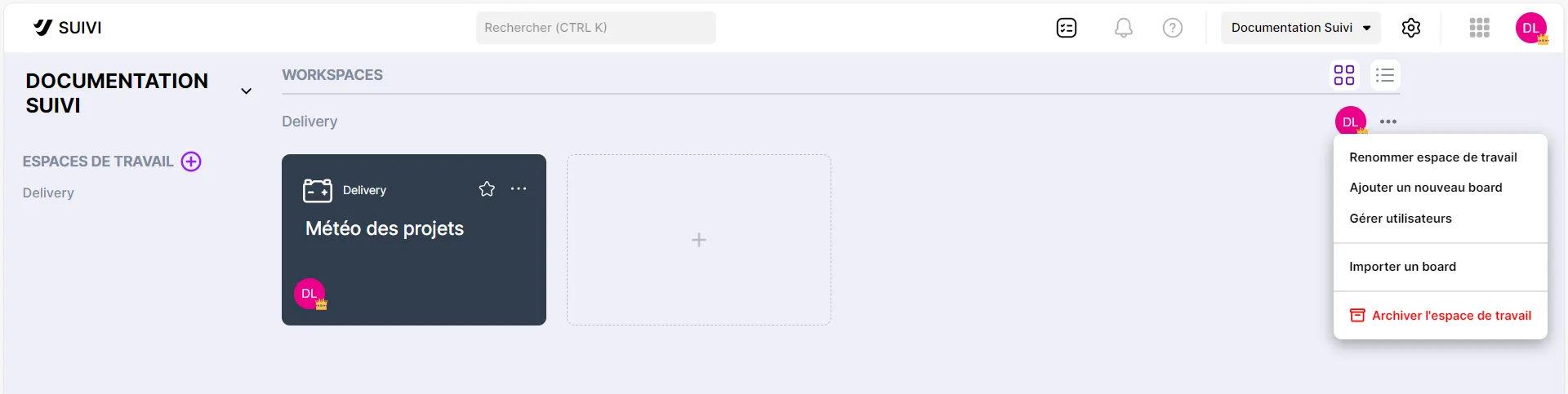 L’espace de travail est l’élément de travail de base dans l’application Suivi. Il est impossible de créer vos boards tant que vous n’avez pas créé au moins un espace de travail. Vous pouvez d’ailleurs en créer autant que souhaité en fonction de vos besoins.