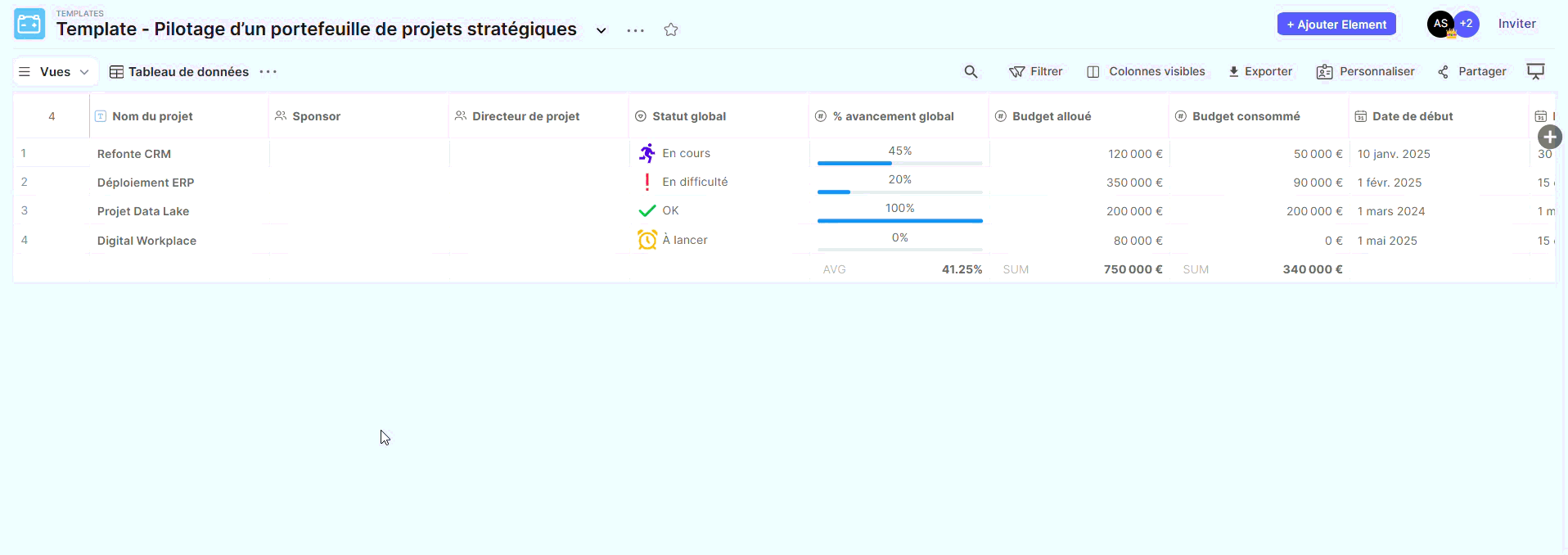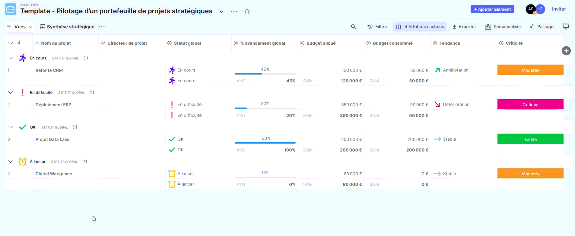 Vue tableau synthétique offrant une vision d’ensemble du portefeuille projets.