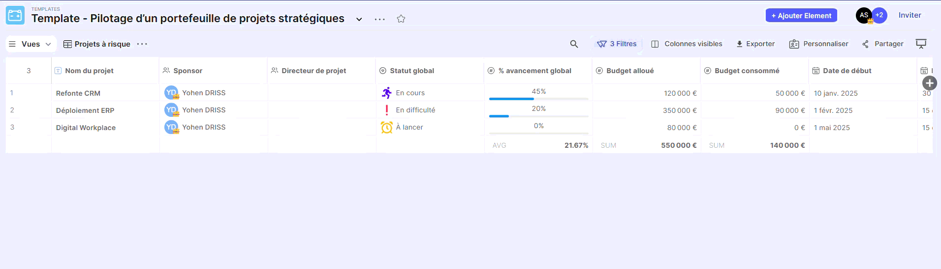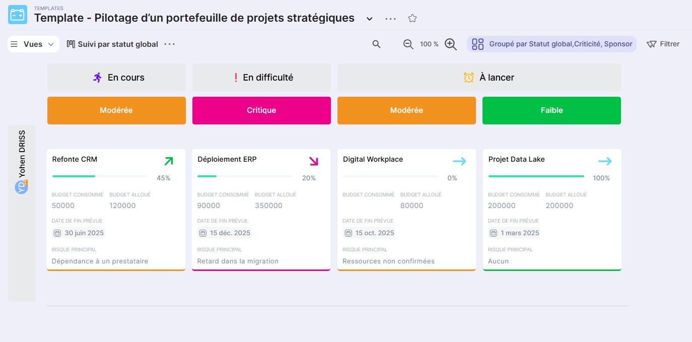 Ce modèle permet de suivre l’ensemble des projets de l’organisation avec une vision claire, synthétique et adaptée aux instances de gouvernance (direction, comité de pilotage, PMO).