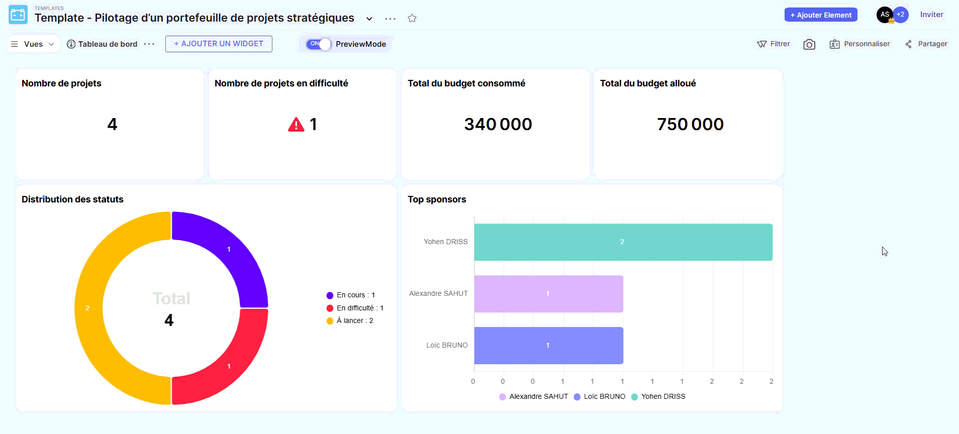 Vue synthétique regroupant plusieurs indicateurs clés du portefeuille projets.