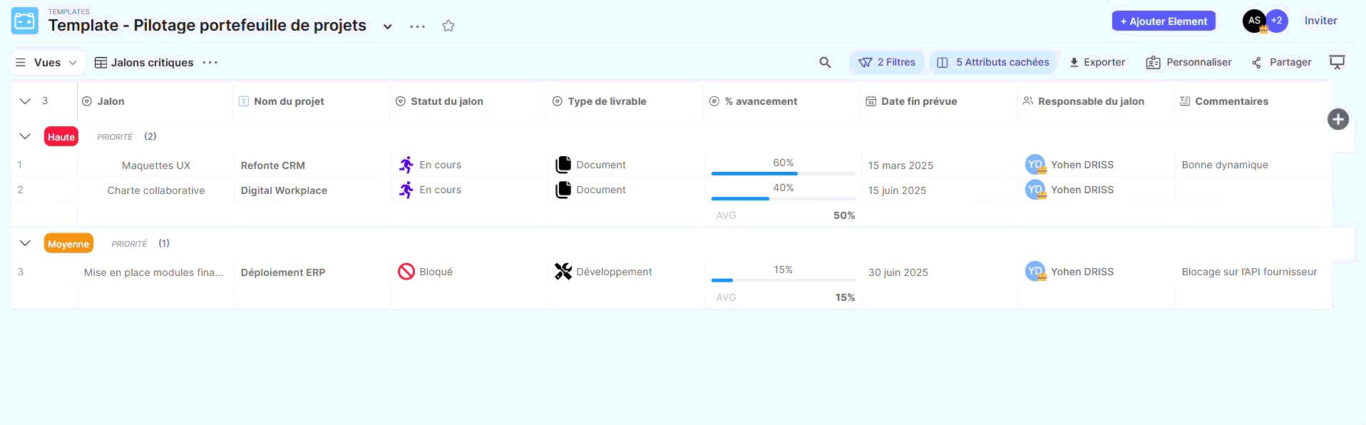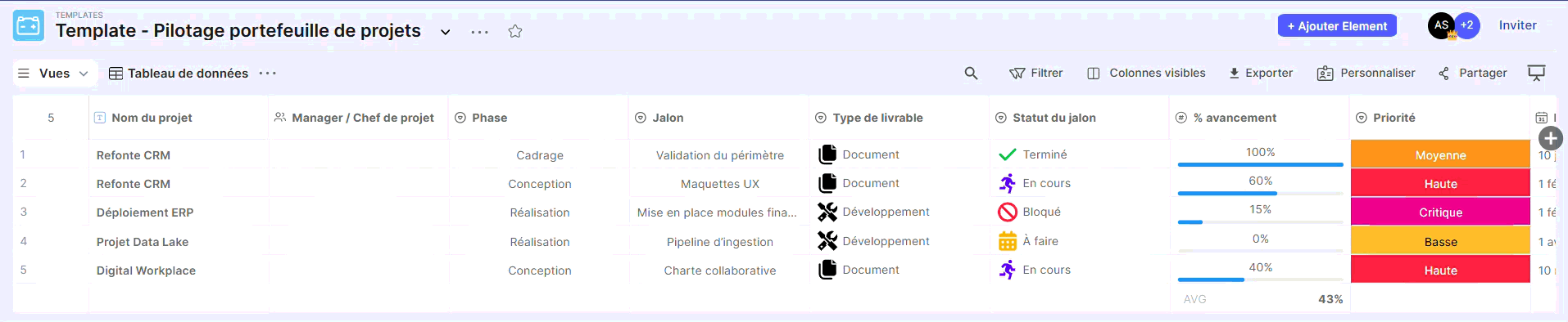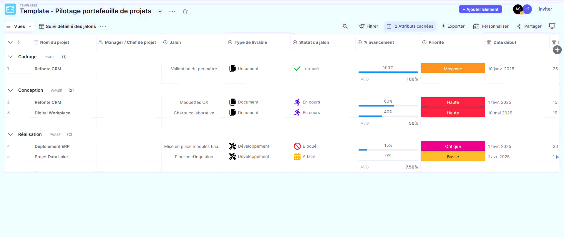 Le template permet de suivre l’avancement des projets en termes de jalons, phases, priorité, responsable, dates clés et progression.