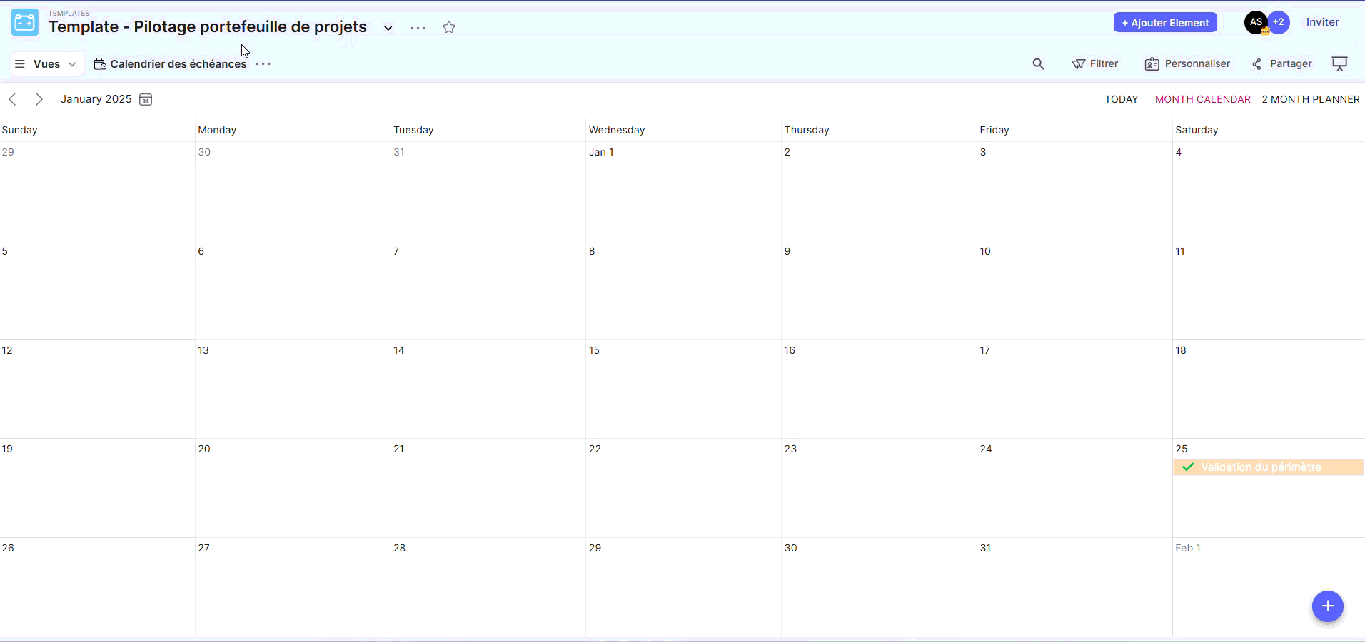 Visualiser les dates clés du projet dans un calendrier mensuel.